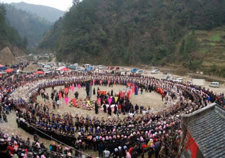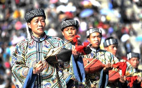 People of the Miao ethnic group perform traditional dance during the closingcelebration of the Guzang Festival.
