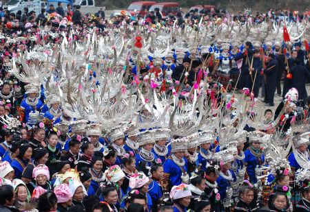 People of the Miao ethnic group perform traditional dance during the closingcelebration of the Guzang Festival.