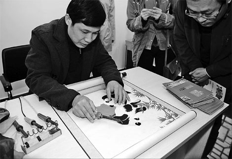 He uses an electric iron and then begins to draw on a piece of black cloth, as a giant panda begins to take shape. The pattern is beautiful, like a Chinese ink painting, but has a raised surface, like relief sculpture. Cloth sculpture is a folk art invented by 46-year-old Zheng Zhenhuai, a farmer from Huaibin county, Henan province, that was adapted from traditional Chinese cloth pasting paintings and has animal-like or plant-like patterns stuck together by paste or string.