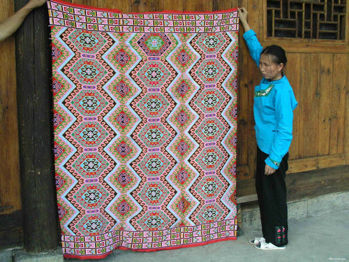 Tujia brocade has a long history and can be traced back to the second century B.C. According to historical records, it once boasted over 400 traditional patterns, of which more than half can be seen today. Some depict the natural world, while others show astronomical phenomena, geography or local customs and legends. Around 160 of these are preserved in or close to Laochehe Village, knowledge of which is passed down from person to person and held in their memories. There is no book or written record of those complicated patterns or how to make them.
