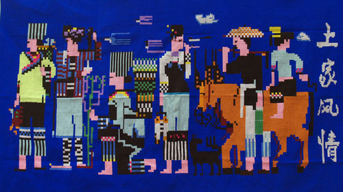 However, changes such as the improvement of living standards and the development of tourism, as well as the new fast pace of modern life and commercialization, have all affected Tujia brocade. Traditional Tujia brocade weaving is time-consuming, and the brocade workshop established by Liu and her sisters in 1995 had slack sales. With no promise of a positive future, fewer and fewer people want to weave traditional Tujia brocade, and Liu has been anxious about the possibility of the craft disappearing. In order to keep the skill alive, Liu has insisted that her daughter-in-law learn it and keep up its practice. “We should let people see traditional Tujia brocade so we can save the craft from dying out,” says Liu.