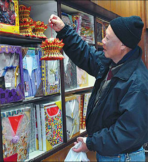 Tony Huie, who emigrated to the United States in 1966, checks a paper lantern-shaped money basket at a funeral supplies store in New York's Chinatown. Wang Jingshu / China Daily