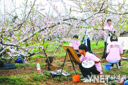 Students attend a drawing lesson in the peach blossom fields of Pinggu. [Photo: YNET.com]