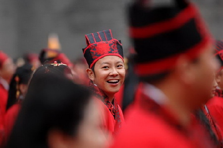 A bridegroom smiles at the group wedding ceremony which follows ancient Chinese nuptial rites in Xi'an, capital of northwest China's Shaanxi Province, May 1, 2012. A total of 130 newlyweds here chose to attend the group wedding ceremony, which followed the marriage rites of the Han Dynasty (220 B.C.-220 A.D.).