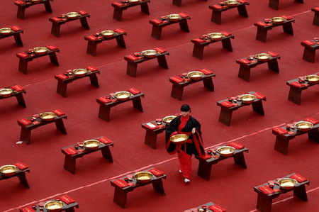 A staff member prepares for the group wedding ceremony which follows ancient Chinese nuptial rites in Xi'an, capital of northwest China's Shaanxi Province, May 1, 2012. A total of 130 newlyweds here chose to attend the group wedding ceremony, which followed the marriage rites of the Han Dynasty (220 B.C.-220 A.D.).
