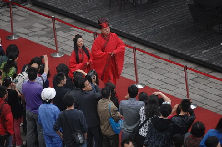 A newlywed attends the group wedding ceremony which follows ancient Chinese nuptial rites in Xi'an, capital of northwest China's Shaanxi Province, May 1, 2012. A total of 130 newlyweds here chose to attend the group wedding ceremony, which followed the marriage rites of the Han Dynasty (220 B.C.-220 A.D.).