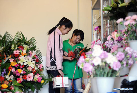 A girl selects flowers for her mother at a store in Taiyuan, capital of north China's Shanxi Province, May 13, 2012. Some citizens in Taiyuan chose to present flowers to their mother to celebrate the Mother's Day. (Xinhua/Yan Yan)