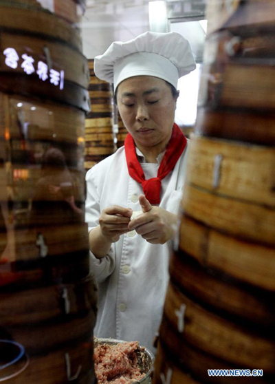 A chef makes Xiaolongbao at the Nanxiang Steamed Bun Restaurant in Shanghai, east China, April 30, 2012. The Nanxiang Steamed Bun Restaurant was founded in 1900 and it is located at the Yuyuan Garden in Shanghai. At holiday times such as the Labor Day holiday that lasts from April 29 to May 1 this year, many tourists and local residents flocked to the restaurant to experience its famed food Xiaolongbao, a compact, meaty dumpling with traditional Shanghainese flavour. On some busy days, about 150 staff members of the restaurant may work 8 hours to sell 7,000 boxes of the Xiaolongbao per day. (Xinhua/Liu Ying)