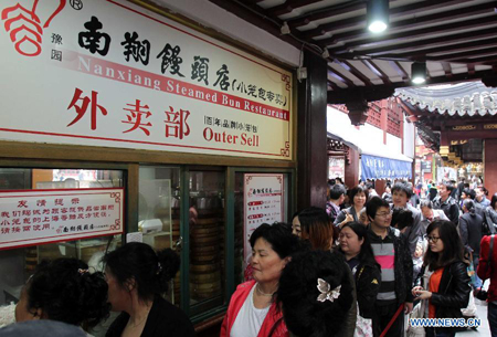 People queue at the Nanxiang Steamed Bun Restaurant to buy Xiaolongbao in Shanghai, east China, April 30, 2012. The Nanxiang Steamed Bun Restaurant was founded in 1900 and it is located at the Yuyuan Garden in Shanghai. At holiday times such as the Labor Day holiday that lasts from April 29 to May 1 this year, many tourists and local residents flocked to the restaurant to experience its famed food Xiaolongbao, a compact, meaty dumpling with traditional Shanghainese flavour. On some busy days, about 150 staff members of the restaurant may work 8 hours to sell 7,000 boxes of the Xiaolongbao per day. (Xinhua/Liu Ying)
