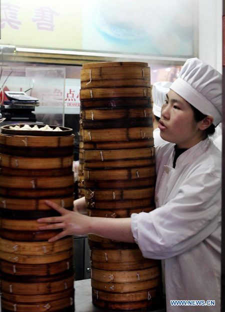 A chef makes Xiaolongbao at the Nanxiang Steamed Bun Restaurant in Shanghai, east China, April 30, 2012. The Nanxiang Steamed Bun Restaurant was founded in 1900 and it is located at the Yuyuan Garden in Shanghai. At holiday times such as the Labor Day holiday that lasts from April 29 to May 1 this year, many tourists and local residents flocked to the restaurant to experience its famed food Xiaolongbao, a compact, meaty dumpling with traditional Shanghainese flavour. On some busy days, about 150 staff members of the restaurant may work 8 hours to sell 7,000 boxes of the Xiaolongbao per day. (Xinhua/Liu Ying)