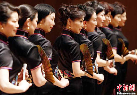 Women wearing cheongsams pose at a ceremony under the theme "Promoting Cheongsam Culture, Cultivating Elegance" at the Shanghai Oriental Art Center on May 20, in order to carry forward the Chinese cheongsam culture.(chinanews.com)