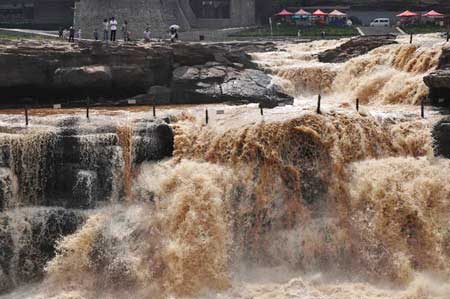 Visitors watch the Hukou Waterfall of Yellow River in Jixian County of Linfen City, north China's Shanxi Province, June 4, 2012. (Xinhua/Lu Guiming)