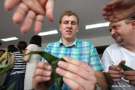 Foreigners learn to make "Zong Zi", a kind of glutinous rice dumplings wrapped in bamboo or reed leaves, at an event held for foreigners ahead of China's Dragon Boat Festival in Nantong, east China's Jiangsu Province, June 17, 2012. The event, the first of its kind, invited more than 50 foreigners from 12 countries to join in the celebration of the Dragon Boat Festival in the Hongqiao community in Nantong. The Dragon Boat Festival, also called Duanwu Festival, is traditionally celebrated on the fifth day of the fifth lunar month. It falls on June 23 this year. (Xinhua/Huang Zhe)