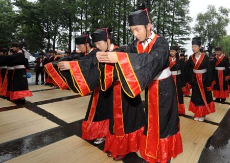 Students who study Chinese national culture worship during a commemorative ceremony for Qu Yuan, the venerable patriotic poet of the Chu State in the Warring States Period (476 - 221 BC), in Wuhan, capital of central China's Hubei Province, May 28, 2009.