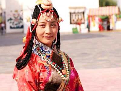 Her bazhu headdress is complemented with silver coins that spangle her braids.. She also wears big earrings, layers of necklaces, rings and strings of coins over her shoulders and at the waist, along with a belt of engraved silver, jade and coral ornaments with a bronze fastening.
