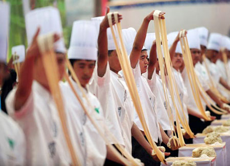 Chefs make noodles during the Beef Noodle Festival in Lanzhou, Northwest of China's Gansu province, on Aug 6. Noodles are an essential ingredient and staple in Chinese cuisine. Lanzhou is famous for the pulled noodles where the dough is repeatedly stretched and folded to produce thinner and thinner strands before being boiled with beef. While Shanxi province is known for making noodles by peeling thin strips of dough from a loaf directly into the boiling water. Gansu provincial government has implemented new measures, including a small credit loan and occupational accreditation, to improve the quality of Lanzhou noodle and standardize the noodle industry that can be traced back to 200 years ago. It is reported that now there are over 50,000 Lanzhou Beef Noodle restaurants in China, providing employment for one million people. The festival runs from Aug 6 to 26. (Xinhua)