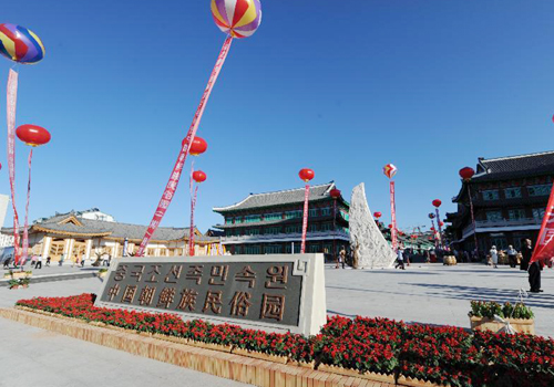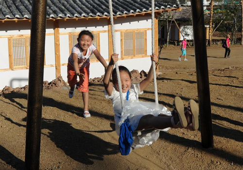 Children play the swing in the Korean Ethnic Group Folk Custom Park in Yanji City, northeast China's Jilin Province, Sept. 2, 2012. The newly-established park embraced its first visitors on Sunday, offering people a chance to know more about the folk customs of the Korean ethnic group.
