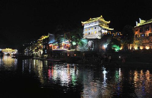 Houses along a river are illuminated in the ancient town of Fenghuang in Fenghuang County, central China's Hunan Province, Sept. 4, 2012. The townlet is famed for its time-honored houses and cultural relics, attracting visitors from home and abroad.