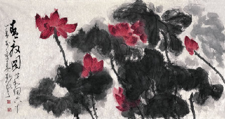 Looking down on Zhongguancun South, a busy street in downtown Beijing, from an old office building, Cai’s two-room studio feels cocooned from the city’s hectic life. The other room holds a tea table, where Cai offers guests a cup of tea or a shot of wine before giving them a demonstration of how he paints. In the tearoom, a horizontally placed work of calligraphy announces the name of Cai’s workplace, “Jing Feng Ge” or Peaceful Wind Studio.