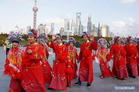 Newlyweds wearing traditional Chinese costumes walk in Waitan area along the Huangpu River during a group wedding ceremony held in Shanghai, east China, Sept. 26, 2012. (Xinhua/Zheng Xianzhang)