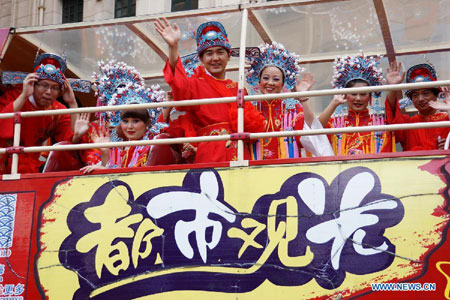Newlyweds wearing traditional Chinese costumes wave to photographers while boarding on a tourist double decker bus on Nanjing Road during a group wedding ceremony held in Shanghai, east China, Sept. 26, 2012. (Xinhua/Zheng Xianzhang)