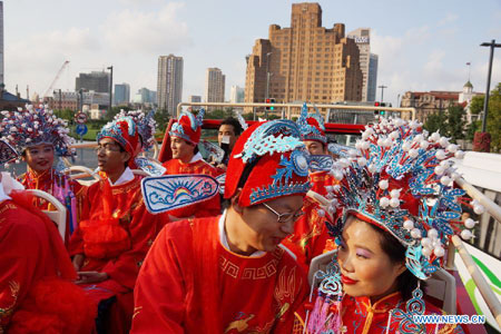 Newlyweds wearing traditional Chinese costumes board on a tourist boat on the Huangpu River during a group wedding ceremony held in Shanghai, east China, Sept. 26, 2012. (Xinhua/Zheng Xianzhang)