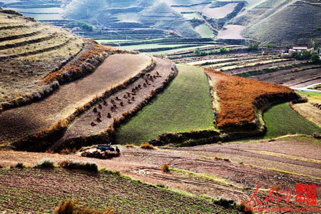 The unique landform and autumn scenery of the back hill of Huoshi Village located in Liupan Mountain, 15 kilometers northeast from Xiji County, north China's Ningxia Hui Autonomous Region. (chinapic.people.com.cn)