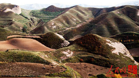 The unique landform and autumn scenery of the back hill of Huoshi Village located in Liupan Mountain, 15 kilometers northeast from Xiji County, north China's Ningxia Hui Autonomous Region. (chinapic.people.com.cn)