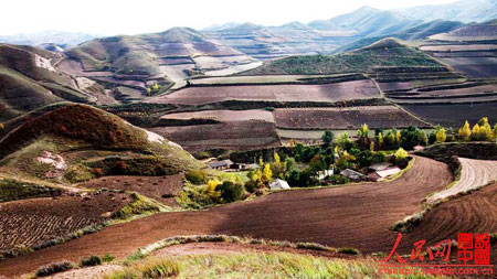 The unique landform and autumn scenery of the back hill of Huoshi Village located in Liupan Mountain, 15 kilometers northeast from Xiji County, north China's Ningxia Hui Autonomous Region. (chinapic.people.com.cn)