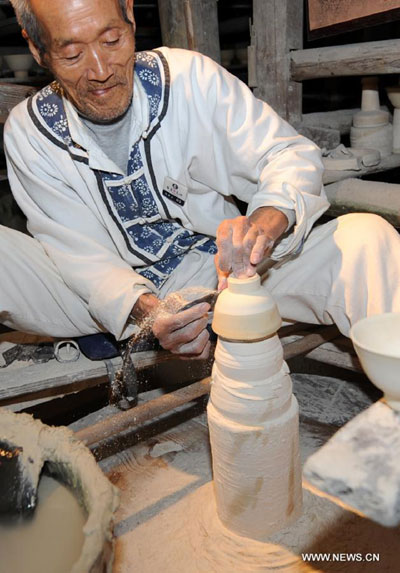 Porcelain artisan Chen Shengfa refines the surface of dried porcelain bases in Jingdezhen, east China's Jiangxi Province, Oct. 20, 2012. Jingdezhen is known as China's "Porcelain Capital" because of its production of fine porcelain wares for more than a thousand years. (Xinhua/Zhou Ke)