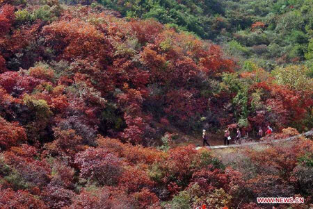 Tourists enjoy autumn red leaves in the Changshou Mountain Scenic Area in Gongyi, central China's Henan Province, Oct. 23, 2012. (Xinhua/Wang Song)