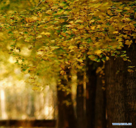 Photo taken on Nov. 4, 2012 shows yellow ginkgo leaves in Tancheng County of Linyi City, east China's Shandong Province. Most cities in northern part of China now receive beautiful autumn views as colder weather goldens tree leaves. (Xinhua/Xu Chenghong)