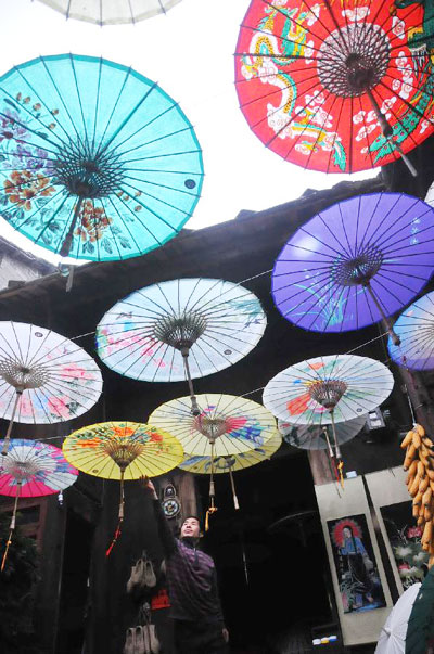 A craftsman checks oil-paper umbrellas at a workshop in Xixiu District of Anshun City, southwest China's Guizhou Province, Nov. 12, 2012. Made of oiled paper and bamboo frame, oil-paper umbrella is a traditional Chinese handicraft. The skills of making oil-paper umbrellas were introduced to Guizhou in early Ming Dynasty (1368-1644). (Xinhua/Huang Yong)