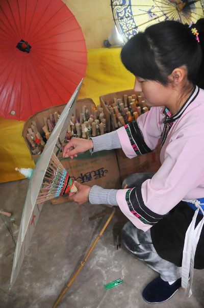 A worker processes oil-paper umbrellas at a workshop in Xixiu District of Anshun City, southwest China's Guizhou Province, Nov. 12, 2012. Made of oiled paper and bamboo frame, oil-paper umbrella is a traditional Chinese handicraft. The skills of making oil-paper umbrellas were introduced to Guizhou in early Ming Dynasty (1368-1644). (Xinhua/Huang Yong)