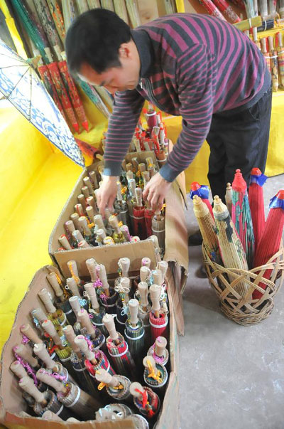 A craftsman processes oil-paper umbrellas at a workshop in Xixiu District of Anshun City, southwest China's Guizhou Province, Nov. 12, 2012. Made of oiled paper and bamboo frame, oil-paper umbrella is a traditional Chinese handicraft. The skills of making oil-paper umbrellas were introduced to Guizhou in early Ming Dynasty (1368-1644). (Xinhua/Huang Yong)