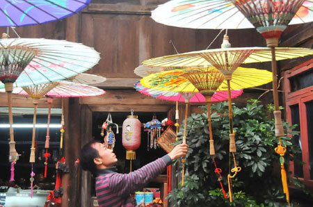 A craftsman views oil-paper umbrellas at a workshop in Xixiu District of Anshun City, southwest China's Guizhou Province, Nov. 12, 2012. Made of oiled paper and bamboo frame, oil-paper umbrella is a traditional Chinese handicraft. The skills of making oil-paper umbrellas were introduced to Guizhou in early Ming Dynasty (1368-1644). (Xinhua/Huang Yong)