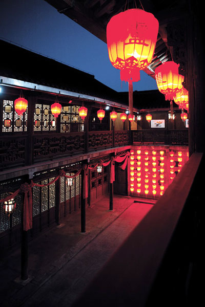 Red lanterns are hung up high at night in the Dwelling of Lu Shaoxu.(Shanghai Daily)