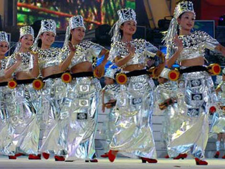 The wedding ceremony of Jingpo people is sometimes held in the afternoon. The firing of three guns suggests the people escorting the bride in a procession are returning. In front of the procession are the man's matchmaker, carrying a red wooden box on her shoulder, and the woman's matchmaker, with new bedclothes in a basket on her back. In the middle of the procession is the bride who is surrounded by her maids of honor. The charming bride, who wears a short black shirt, a red embroidered tube skirt, and a pair of leather shoes, goes silently and shyly to an obstacle. Then her matchmaker leaves the procession immediately, gives the "guards," a group of girls, some wine to drink, some wedding candy and money. However, they are not satisfied with this and shout: "Don't let the bride go!" But the maids of honor already help the bride pass through the obstacle on the other side.