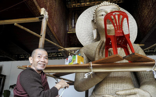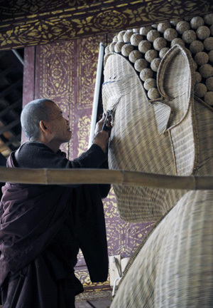 A monk weaves with bamboo to make a Buddha statue at a Dai folk custom park in Menghan township of Xishuangbanna Dai Autonomous Prefecture, southwest China's Yunnan Province, Dec. 9, 2012. In the town teeming with bamboos, local poeple take advanctage of the bamboo weaving handicraft to develop tourism.