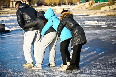 People enjoy themselves upon the ice in Taoranting Park in Beijing, capital of China, Dec. 17, 2012. (Xinhua/Zhang Cheng)