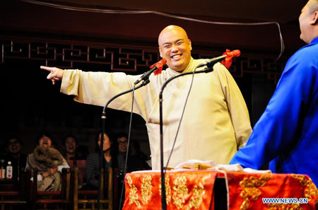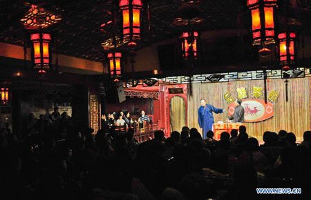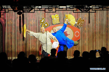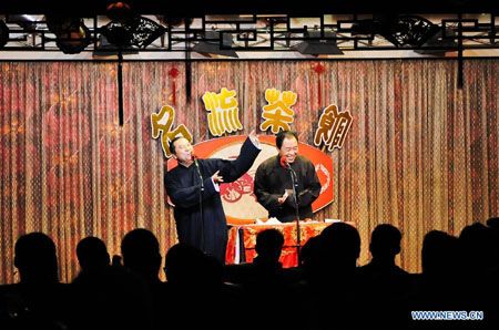 Cross talk actors perform on stage at a teahouse in Tianjin, north China, Jan. 2, 2013. Quite a number of tourists enjoyed the cross talk here during the three-day New Year's Day holiday. The cross talk, or "Xiangsheng" in Chinese, is one of the most popular folk art forms in China.