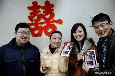 Two couples show their group photos at the marriage registration office in Jiangbei District of Chongqing, southwest China, Jan. 4, 2013. Many couples here rushed to tie the knot on Jan. 4, 2013, or 2013/1/4, which sounds like "Love you forever" in Chinese.