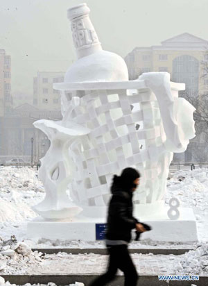 A college student walks past a creation during the 5th International Snow Sculpture Contest for College Students in Harbin, capital of northeast China's Heilongjiang Province, Jan. 7, 2013. The contest, which attracted 58 teams from countries and regions including Britain, Japan, Russia, Thailand and the United States will come to an end soon. (Xinhua/Wang Song)