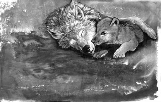 A painting by Li Weiyi shows a slaughtered wolf with her cub by her side.