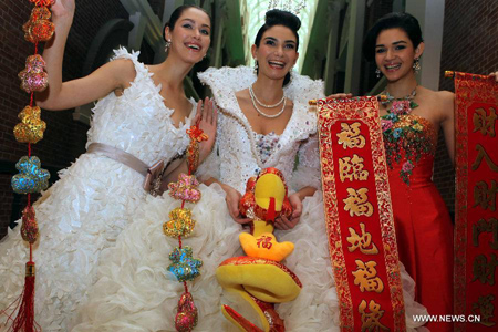 Models present tailor-made wedding dresses during a show on the Bund in Shanghai, east China, Feb. 5, 2012.
