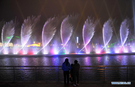Visitors view the laser fountain during a lantern show in Changsha, capital of central China's Hunan Province, Feb. 5, 2013. The lantern show was held to greet the upcoming Spring Festival, or the Chinese Lunar New Year, which falls on Feb. 10 this year.