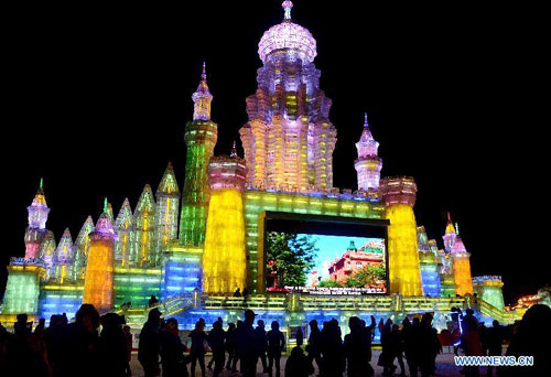 An ice sculpture is displayed at Ice and Snow World in Harbin, capital of northeast China's Heilongjiang Province, Feb. 14, 2013. (Xinhua/Wang Song)