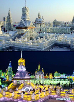 Combo photo taken on Feb. 14, 2013 shows the scenery of Ice and Snow World in Harbin, capital of northeast China's Heilongjiang Province. (Xinhua/Wang Song)