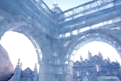 An ice sculpture is displayed at Ice and Snow World in Harbin, capital of northeast China's Heilongjiang Province, Feb. 14, 2013. (Xinhua/Wang Song)
