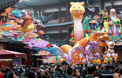 Visitors watch the lantern of snake and dragon at the Yuyuan Garden in Shanghai, east China, Feb. 20, 2013. People went to watch the lantern show at Yuyuan Garden to celebrate the coming Lantern Festival, which falls on Feb. 24 this year. (Xinhua/Pei Xin)